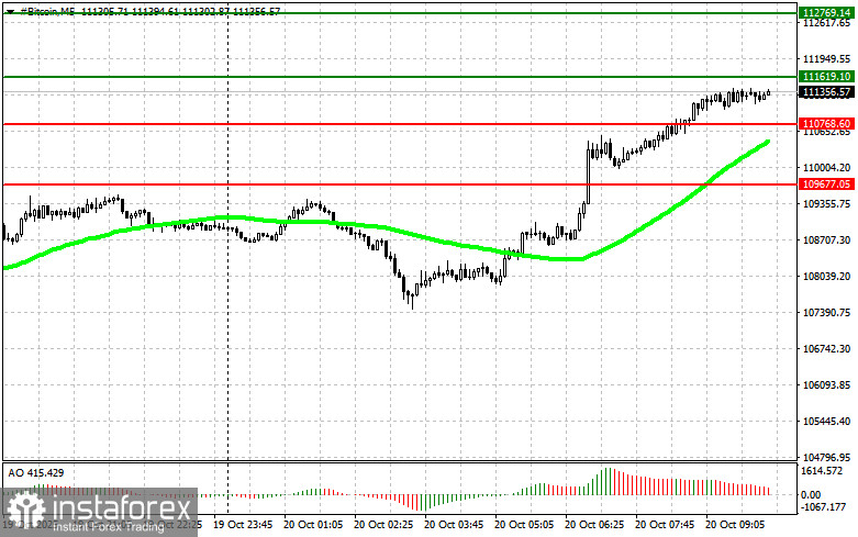 • 情境一:我計劃在今天於進場點接近 $111,600 的位置買入比特幣,目標價位是 $112,700。在接近 $112,700 的位置,我會退出買入交易並立即在回調時開一個空單。在買入突破點之前,請確保50天移動平均線低於當前價格且Awesome Oscillator在正值區域。