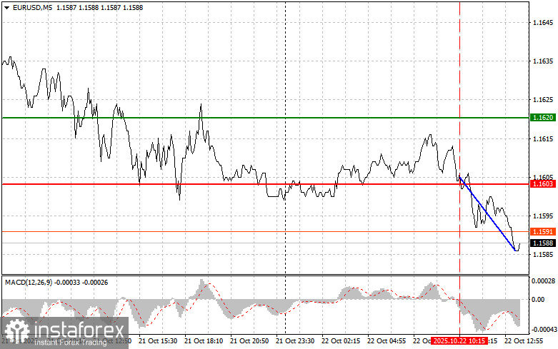 The price test of 1.1603 coincided with the moment when the MACD indicator had just started moving downward from the zero line, confirming the correct entry point for selling the euro. As a result, the pair fell by 15 points.