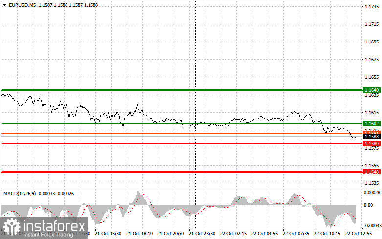 Scenario #2: I also plan to sell the euro if the price tests 1.1602 twice, while the MACD indicator is in the overbought zone. This will limit the pair's upward potential and likely lead to a reversal downward, with targets at 1.1580 and 1.1548.