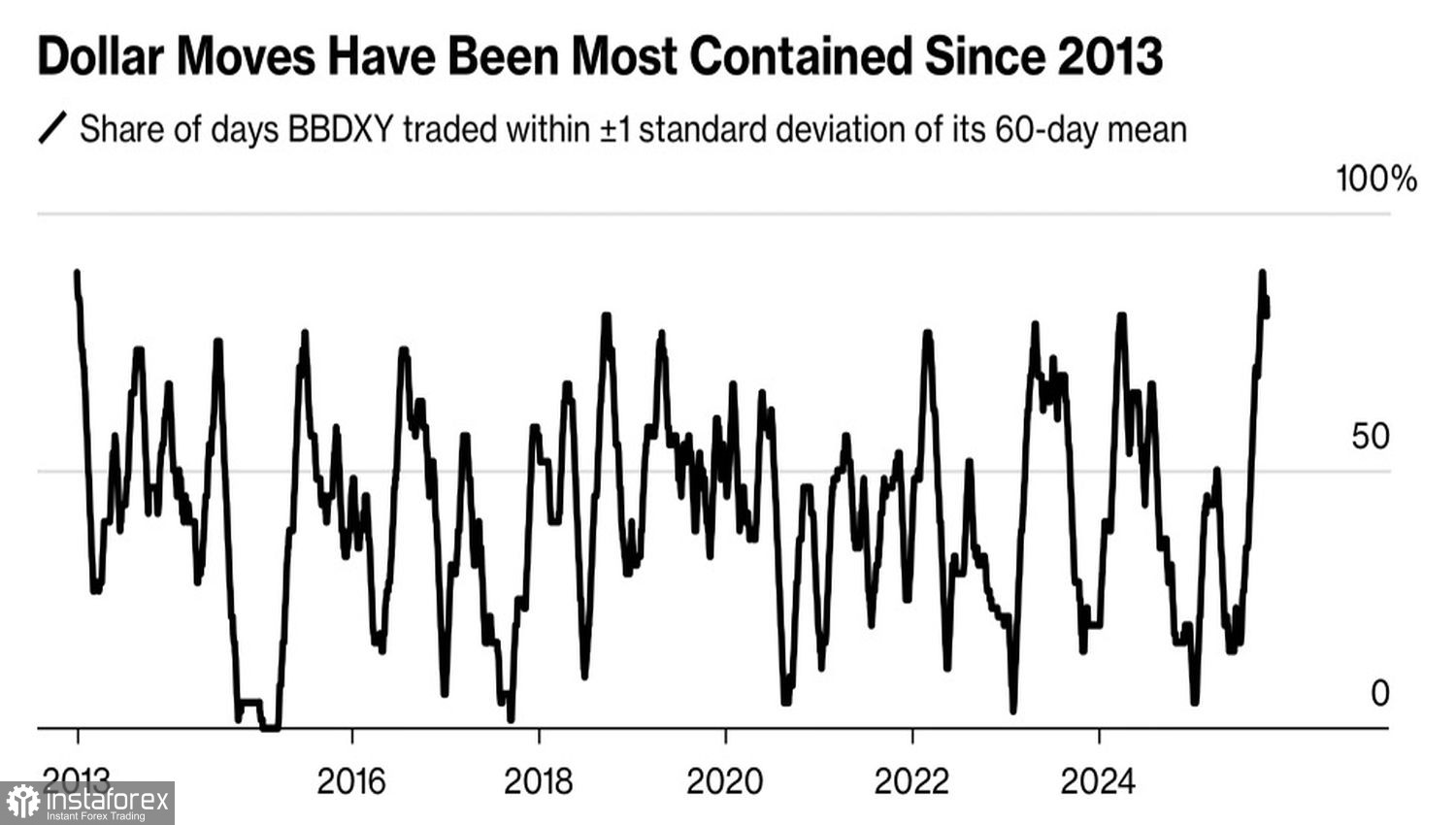 Over the last 60 trading days, the US dollar has remained within one standard deviation of its average 80% of the time. At the beginning of October, that figure stood at 88% — the highest level in over a decade.