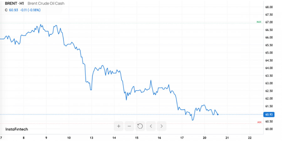 Цены на нефть вновь снижаются. Brent опустилась до $61,11 за баррель, а американская WTI — до $57,37. Это не обвал, но уже третья неделя подряд рынок закрывает в минусе. Причины — старые, но усилившиеся: избыток предложения, охлаждение мировой экономики и растущее напряжение между США и Китаем.