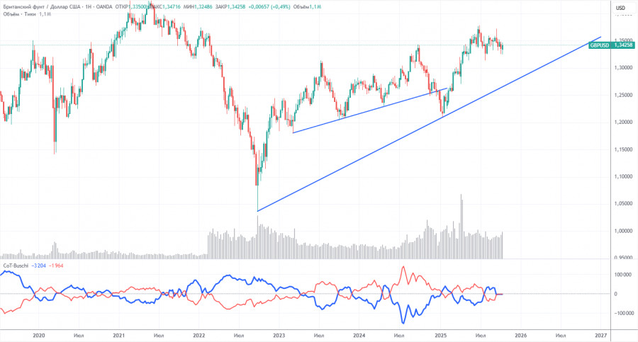 В 2025 году фунт очень сильно вырос, но следует понимать, что причина одна – политика Дональда Трампа. Как только эта причина будет нивелирована, доллар может перейти в рост, но когда это произойдет – не знает никто. Неважно, какими темпами растет или падает нетто-позиция по фунту. По доллару она в любом случае падает и, как правило, более высокими темпами.