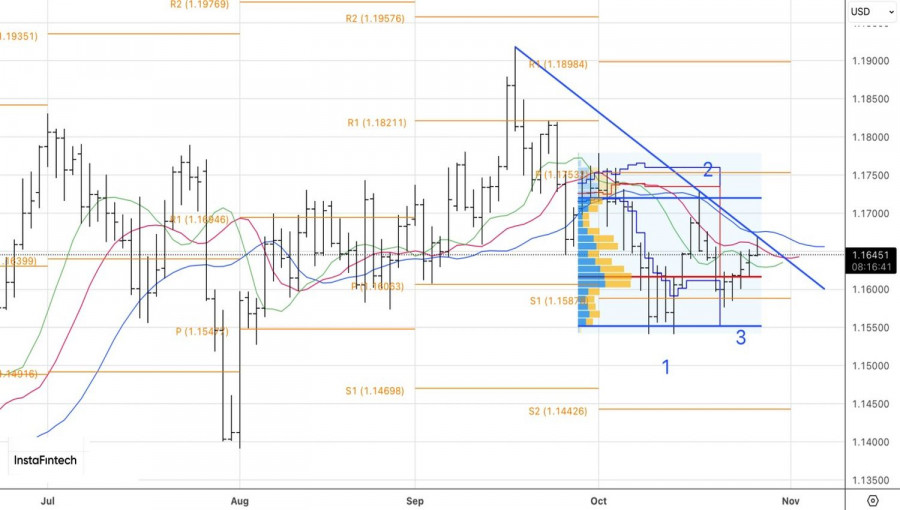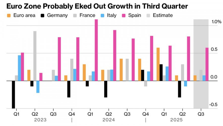 «Быков» не впечатляет твердая уверенность большинства экспертов Bloomberg в окончании цикла монетарной экспансии ФРС. Около 17% респондентов Bloomberg ожидают повышения ставки по депозитам в 2026. Не помогает и позитивная статистика по деловой активности валютного блока и немецкому бизнес-доверию. Инвесторы с опаской смотрят на предстоящий релиз данных по ВВП валютного блока за третий квартал. Ожидается расширение экономики на 0,1% кв/кв.