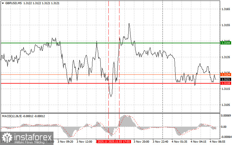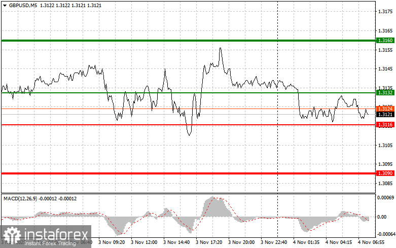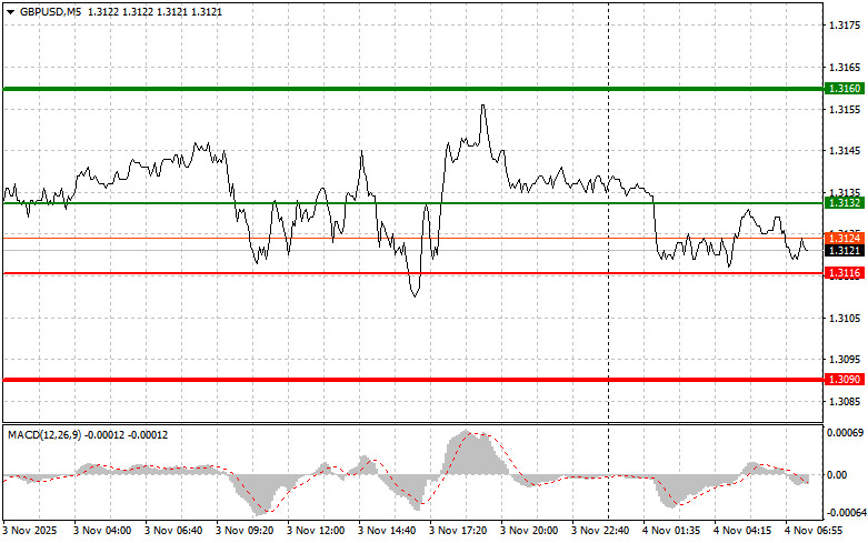 Сценарий №2: покупать фунт сегодня также планирую в случае двух подряд тестов цены 1.3116 в момент, когда индикатор MACD будет находиться в области перепроданности. Это ограничит нисходящий потенциал пары и приведет к обратному развороту рынка вверх. Можно ожидать рост к противоположным уровням 1.3132 и 1.3160.
