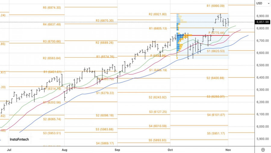 Технически на дневном графике S&P 500 было сформировано два бара с длинной нижней тенью. Они являются признаками слабости «медведей». Рынок продолжает выкупать провалы, поэтому откаты или рост широкого фондового индекса выше 6875 станут поводами для открытия лонгов.