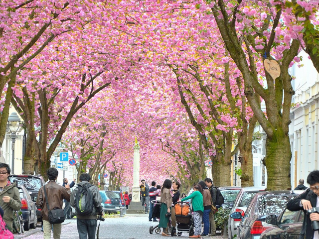 Весной улица Heerstraße в Бонне превращается в настоящий тоннель из цветущей сакуры. Розовые кроны полностью смыкаются над мостовой, создавая сказочный свод. Японские вишни были высажены здесь в 1980-е годы и с тех пор стали символом города. В период цветения улица привлекает туристов и фотографов со всего мира: нежный аромат, мягкий свет и розовая дымка делают это место одним из самых романтичных в Европе. Когда опадают лепестки, тротуары превращаются в розовый ковер весны.