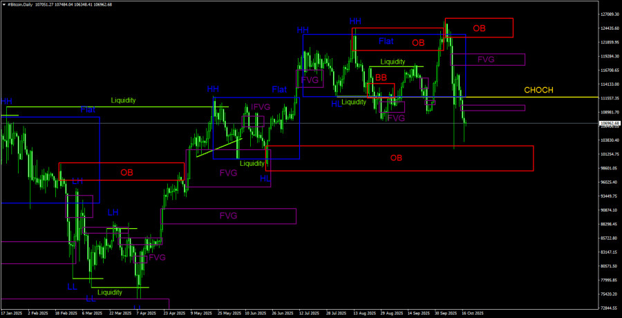 Тем временем, с крупнейших бирж продолжается отток капитала. Про различные альткоины сейчас даже говорить не имеет смысла. Мы не понимаем, кто вообще их будет покупать в ближайшее время на перспективу, если многие из них за час теряли до 100% стоимости. Что касается биткоина, эфира и соланы – «трех столпов крипторынка» – то падение, скорее всего, продолжится. У биткоина на дневном ТФ структура нисходящая, имеется два неотработанных «медвежьих» FVG. «Бычий» OB был отработан, цена скорректировалась, поэтому теперь целью падения выступает следующий «бычий» FVG...