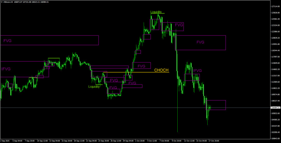 На 4-часовом таймфрейме цена резко обрушилась вниз после снятия ликвидности на продажу и тройной отработки «медвежьего» FVG. Как видим, предупреждения о грядущем падении были даже на 4-часовом ТФ. Напомним, что на дневном ТФ перед падением был сформирован еще один «медвежий» OB и вновь была снята ликвидность на продажу. Поэтому возможностей открывать короткие позиции у трейдеров было в избытке, а ближайшая цель, о которой мы говорили, достигнута. От последнего «медвежьего» IFVG падение возобновилось. В данное время цена вернулась в «медвежий» FVG, поэтому вновь возможна реакция, разворот и новое падение. Если этот паттерн будет отменен, можно будет ожидать небольшую коррекцию к «медвежьему» FVG на дневном ТФ.