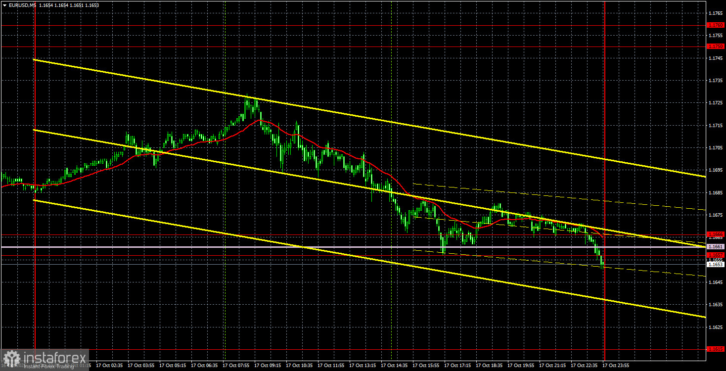 На 5-минутном ТФ цена лишь к вечеру пятницы сумела достичь первые линии и уровни. В течение дня ни одного торгового сигнала сформировано не было. Отскок на американской сессии от области 1,1657-1,1666 давал возможность открывать лонги, но перед закрытием рынка это было бы рискованным шагом.