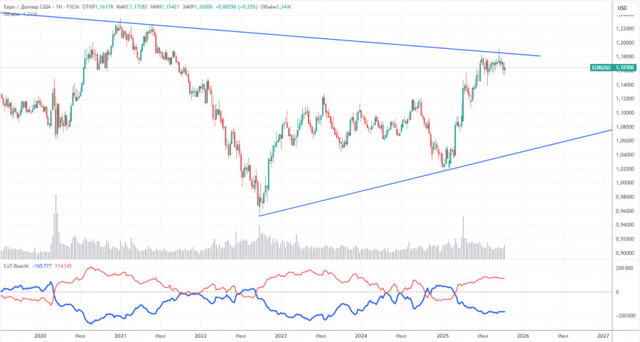 Последний отчет COT датирован 23 сентября. С тех пор больше отчетов COT не было опубликовано из-за «шатдауна» в США. На иллюстрации выше отлично видно, что нетто-позиция некоммерческих трейдеров долгое время была «бычьей», медведи с трудом перешли в зону собственного превосходства в конце 2024 года, но очень быстро ее потеряли. С тех пор, как Трамп вступил в должность президента США во второй раз, падает только доллар. Мы не можем сказать, что падение американской валюты продолжится с вероятностью 100%, но текущее развитие событий в мире намекает именно на этот вариант.