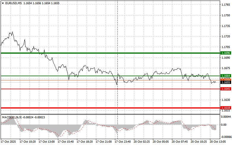 Сценарий №2: покупать евро сегодня также собираюсь в случае двух подряд тестов цены 1.1645, в момент, когда индикатор MACD будет находиться в области перепроданности. Это ограничит нисходящий потенциал пары и приведет к обратному развороту рынка вверх. Можно ожидать рост к противоположным уровням 1.1664 и 1.1696.