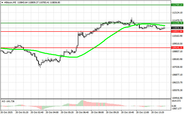 Сценарий №2: покупать биткоин можно от нижней границы $110 500 при отсутствии рыночной реакции на ее пробой в обратную сторону к уровням $111 200 и $112 700.