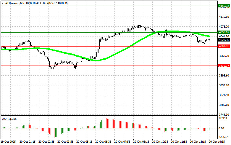 Сценарий №2: покупать эфир можно от нижней границы $4003 при отсутствии рыночной реакции на ее пробой в обратную сторону к уровням $4056 и $4155.