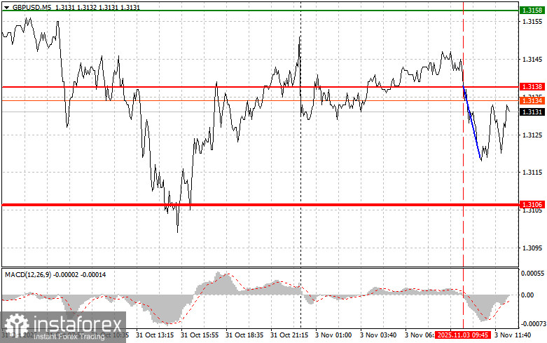 Тест цены 1.3138 пришелся на момент, когда индикатор MACD только начинал движение вниз от нулевой отметки, что стало подтверждением правильной точки входа на продажу фунта и вылилось в падение пары на 20 пунктов.