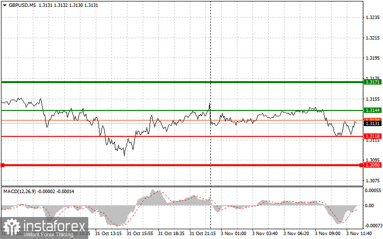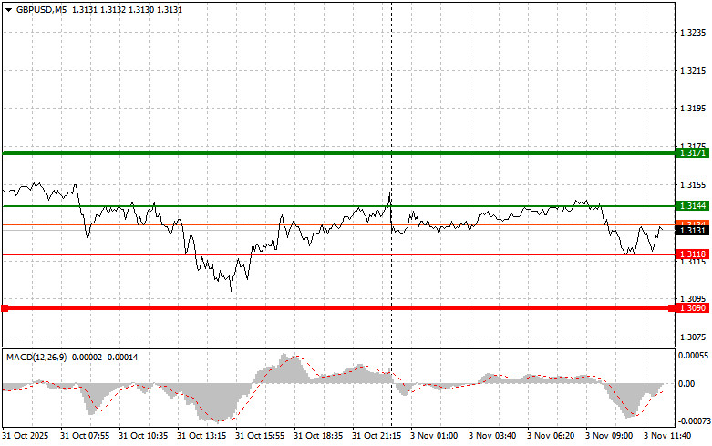 Сценарий №2: покупать фунт сегодня также планирую в случае двух подряд тестов цены 1.3118 в момент, когда индикатор MACD будет находиться в области перепроданности. Это ограничит нисходящий потенциал пары и приведет к обратному развороту рынка вверх. Можно ожидать рост к противоположным уровням 1.3144 и 1.3171.